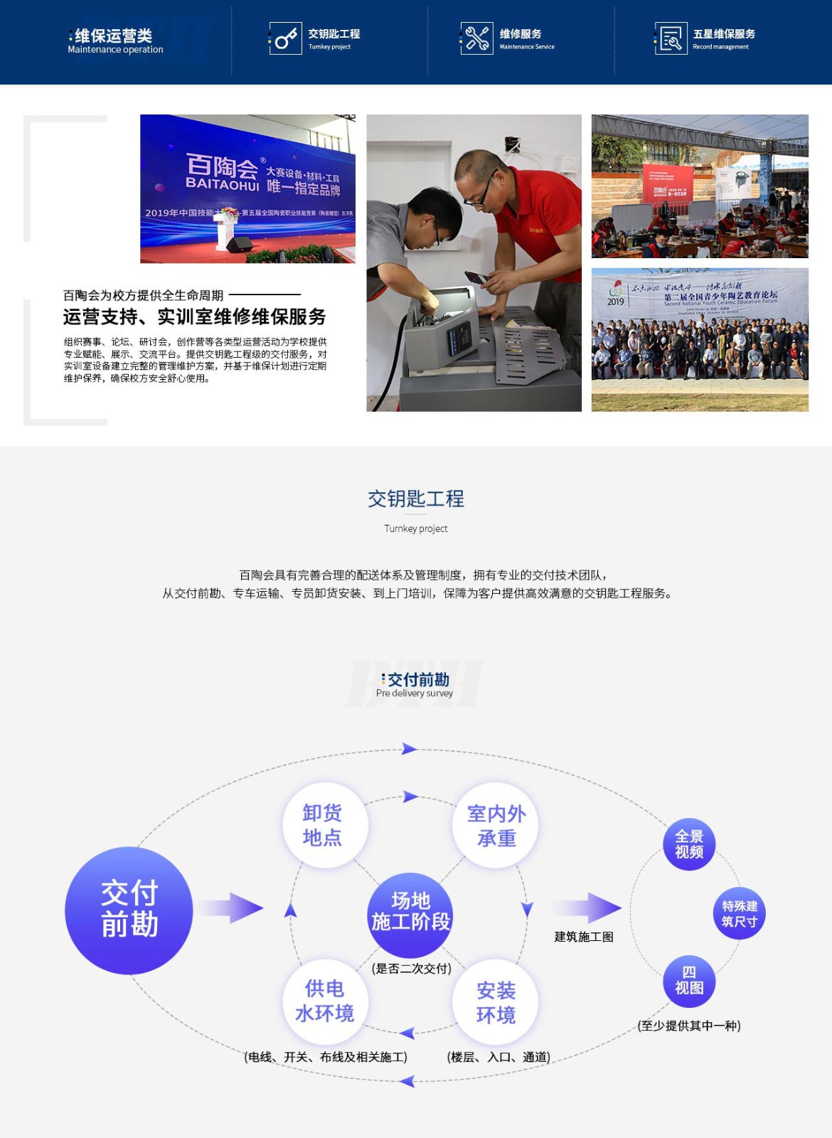 百陶會專業(yè)交付,維修,維保團(tuán)隊20人+;提供從專車運(yùn)輸、專員卸貨、安裝調(diào)試、到上門培訓(xùn)的交鑰匙工程服務(wù)