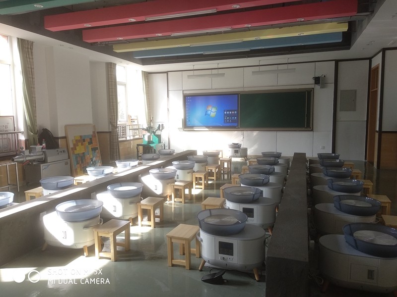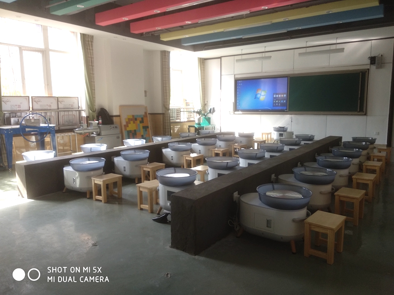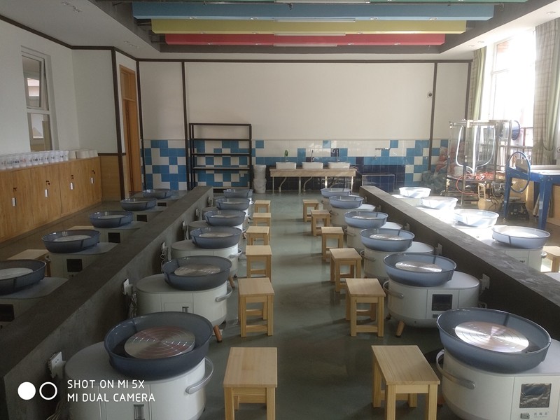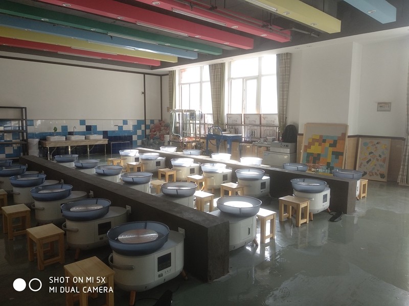 陶藝教室使用面積約200平方米,包括拉坯區(qū)、手工區(qū)、作品展示區(qū)以及燒制區(qū),根據(jù)小學(xué)生生理因素和安全需求,配備了百陶會(huì)最新款的功夫小白智能變頻拉坯機(jī)、智能電窯、泥板機(jī)、練泥機(jī)、施釉臺(tái)等近十余種設(shè)備設(shè)施,可供30人同時(shí)上課。
